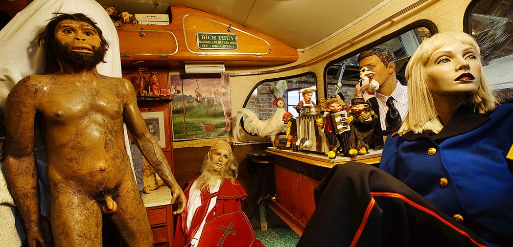 Dies ist eine Prozession von antiken Wohnwagen, eingerichtet mit irren, surrealen Darstellungen von Tier- und Menschenfiguren (das Menschenaffenvolk) und anderen Raritäten.