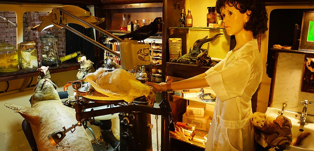 (Der Zahnarzt hat eine seltsame Sammlung – u.a. den Schädel eines Drachen und viel “Gedöns”).